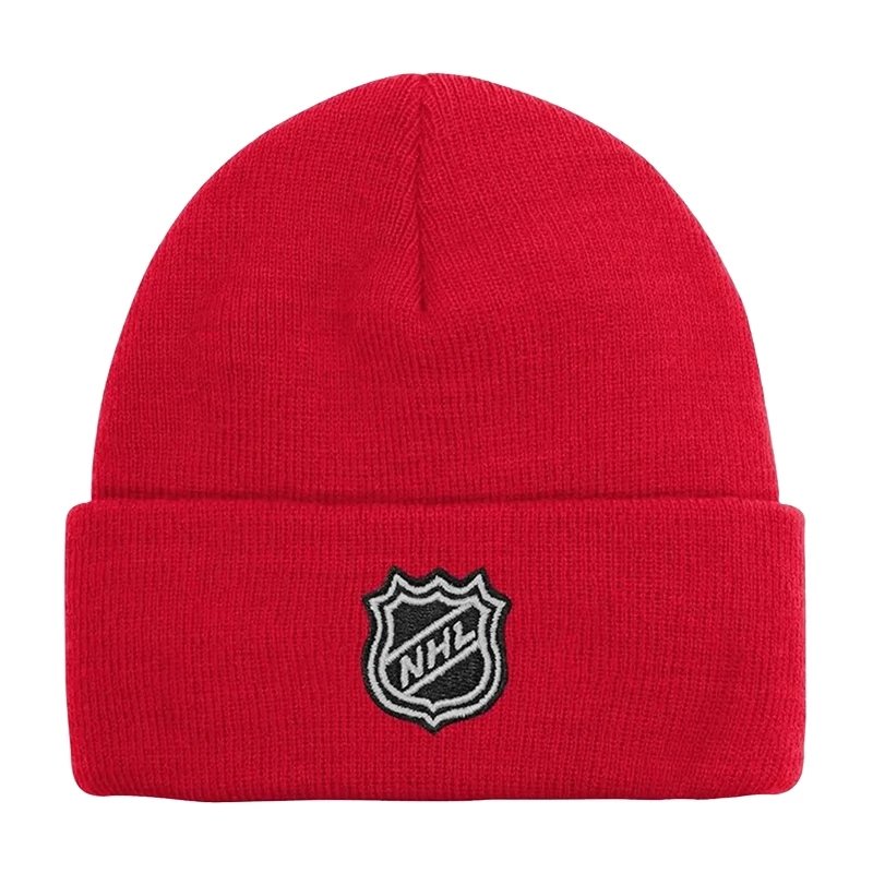Parádní jednoduchá dětská zimní čepice NHL. Zimní čepici bez bambule s manžetovým designem zdobí vepředu nášivka loga týmu a vzadu nášivka loga NHL.