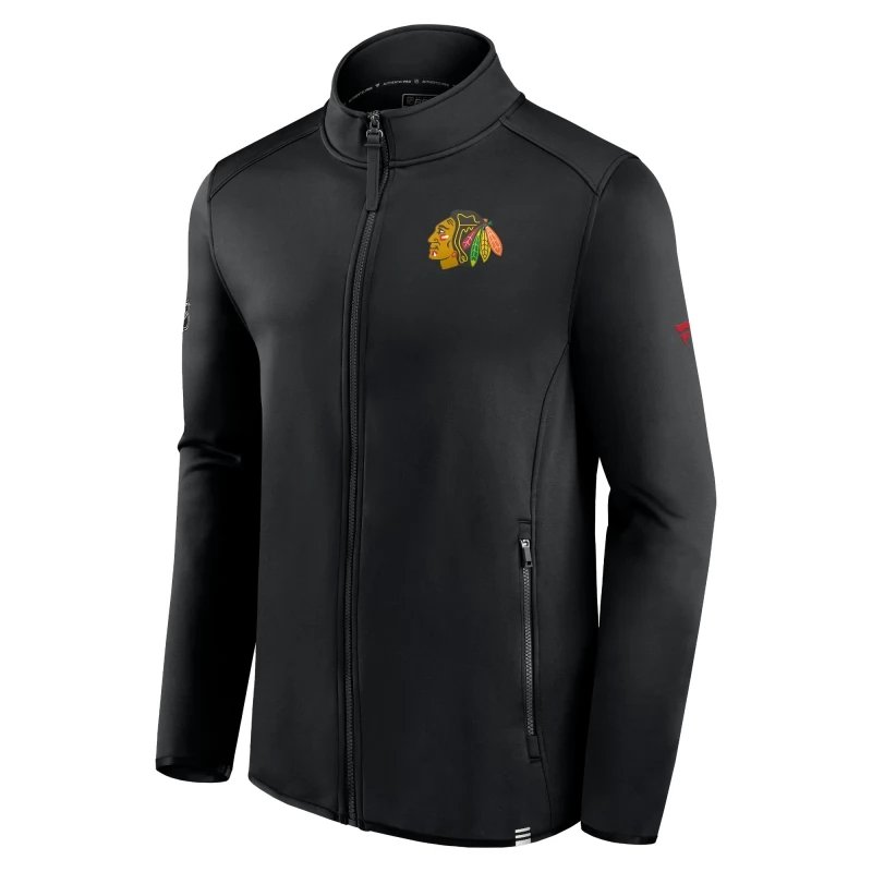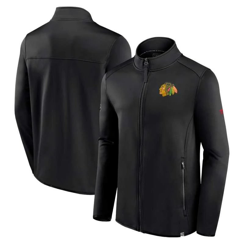 Pánská zapínací bunda s logem NHL týmu Chicago Blackhawks. Středně zateplená bunda se stojacím límečkem je vybavena flísovou podšívkou, zaobleným spodním lemem a dvěma postranními kapsami na zip.