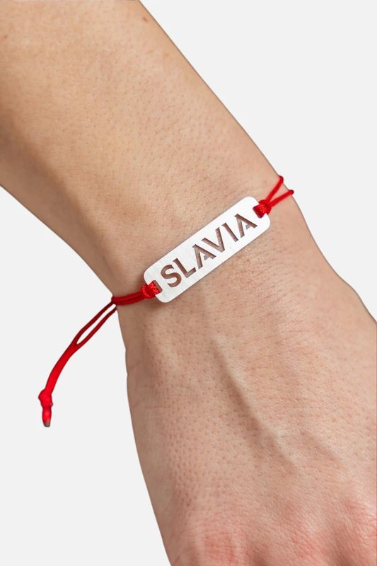 Elegantní náramek Slavia Plate s kovovou destičkou SLAVIA, nastavitelnou červenou šňůrkou a dárkovou krabičkou. Stylový doplněk, který nosí klubovou hrdost každý den.